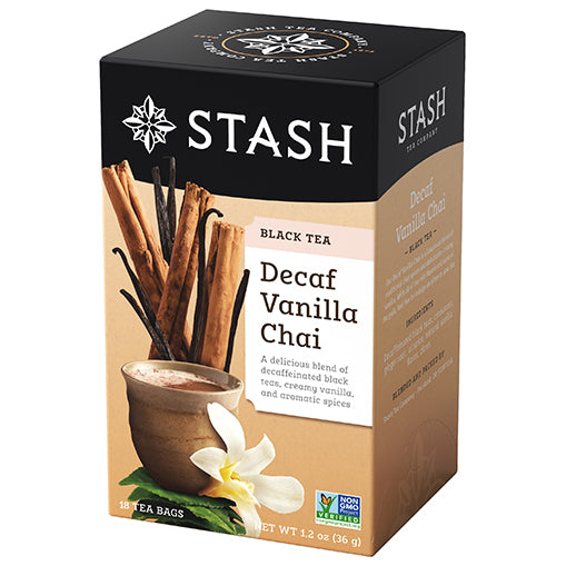 Thé noir naturellement décaféiné, cannelle, racine de gingembre, piment de la Jamaïque, arôme naturel de vanille, clou de girofle